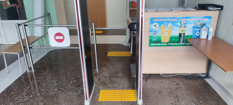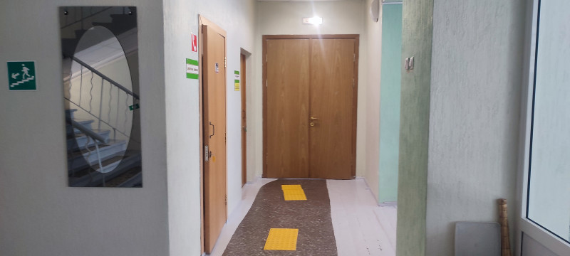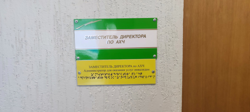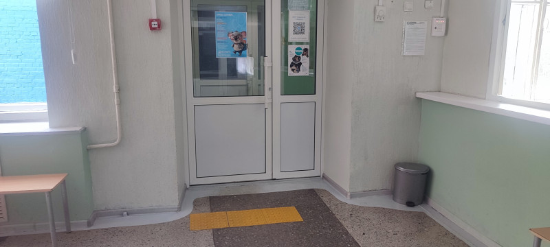 Установлены комплект системы вызова персонала, тактильные плитки, напольные метки, табличка для входной группы с информацией об учреждении со шрифтом Брайля, тактильная табличка на помещении для приема инвалидов, мнемосхема со шрифтом Брайля.